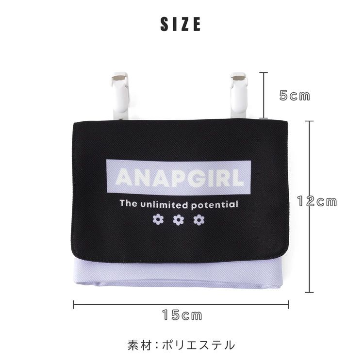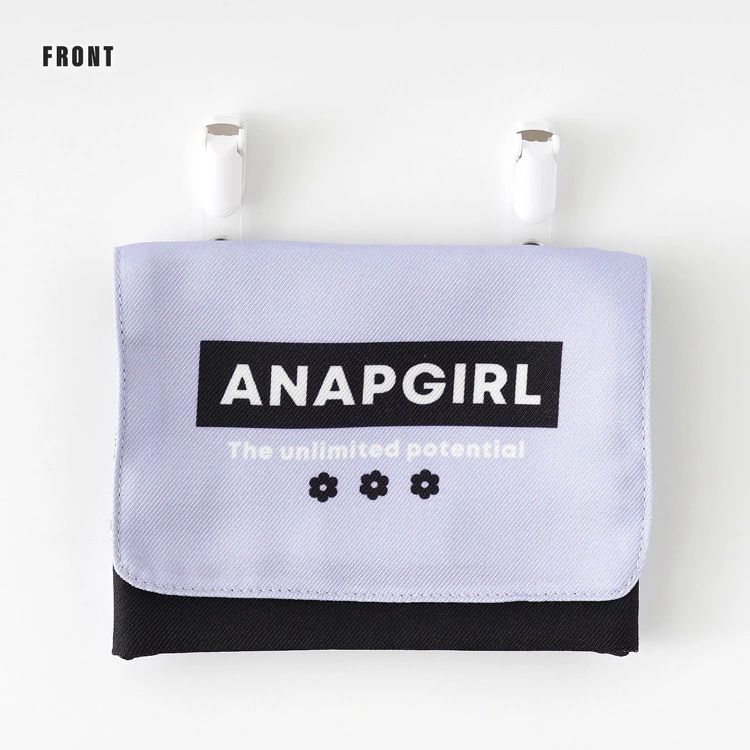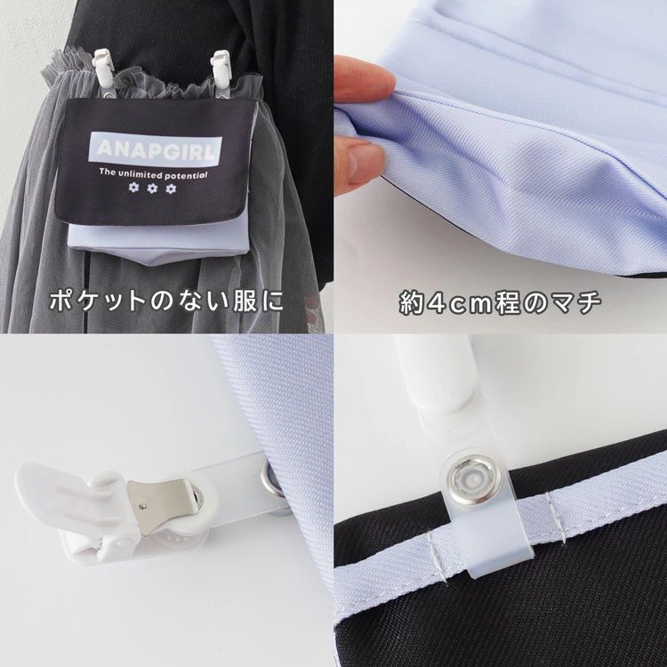 「ANAPGIRL」のマルチポケット。ポケットティッシュや小物入れに使えるマルチポケット。ポケットの付いていない服などに簡単に収納を増やせるのでとても便利で、ウエスト部分にクリップで挟むだけの簡単取り付け。