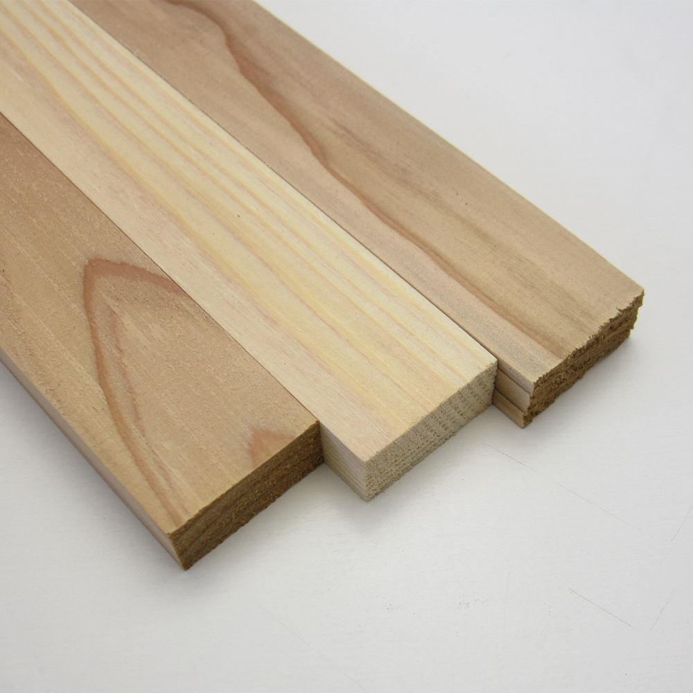 | 日本を代表する木材、杉。軽軟で加工性が良く、木目がはっきりとしていて節は多めとなっております。心材は赤色で耐久性は中程度。辺材は白色で耐久性は低めとなっております。耐水性にやや劣り、木目に沿って縦に割れやすい性質を持っております。建築用材として使われるほか、割裂性を利用して樽桶材や割箸としても多く利用されております。 | |