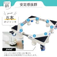 8本ジャッキと太パイプ構造で安定性が高く、洗濯機や冷蔵庫も安心して設置できます。