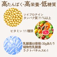 大豆たんぱく(中国製造)、ココアパウダー、植物性乳酸菌(殺菌)、デキストリン/香料、甘味料(スクラロース、アスパルテーム、アセスルファムK)、ビタミンC、抽出ビタミンE、ナイアシン、パントテン酸Ca、ビタミンB1、ビタミンB6、ビタミンB2、ビタミンA、 葉酸、ビタミンD、ビタミンB12