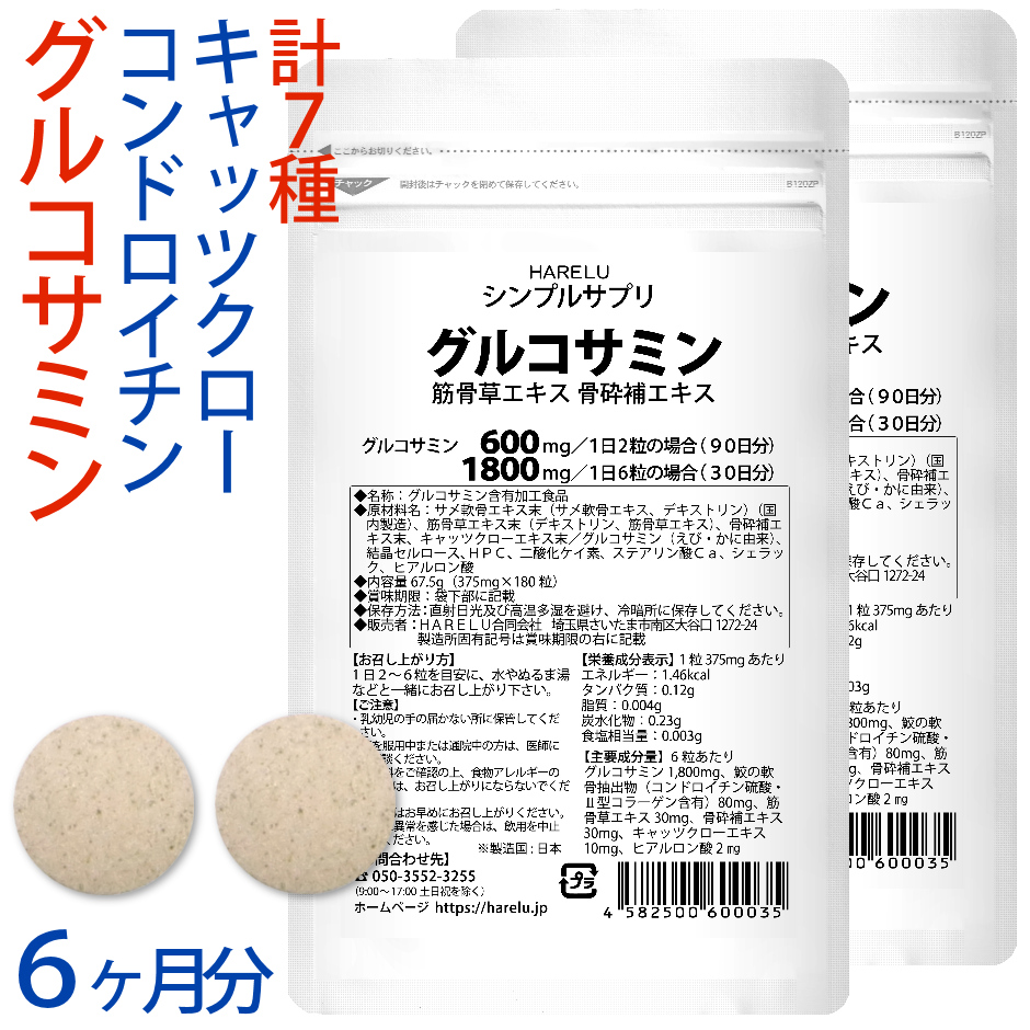 グルコサミン1,800mg、鮫の軟骨抽出物(コンドロイチン硫酸・2型コラーゲン含有)80mg、筋骨草エキス30mg、骨砕補エキス30mg、キャッツクローエキス10mg、ヒアルロン酸2mg