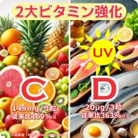 ビタミンCは、皮膚や粘膜の健康維持を助けるとともに、抗酸化作用を持つ栄養素です。栄養素等表示基準値(18 歳以上、基準熱量 2,200kcal)に占める割合:ビタミンC?149%