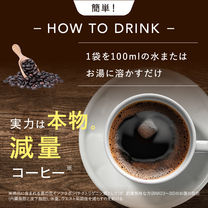 肥満気味な方、BMIが高めな方、お腹の脂肪が気になる方におすすめの機能性表示食品のコーヒーです。 体重やお腹の脂肪(内臓脂肪と皮下脂肪)やウエスト周囲径を減らすのを助ける機能があると報告されている葛の花由来イソフラボン(テクトリゲニン類として)を主成分としています。さらに美容成分として話題の炭(チャコール)やMCTオイル、ブラックジンジャー、22種の乳酸菌、48種の植物発酵エキスを贅沢配合。1杯たったの11kcalなのでカロリーを気にせずコーヒーが楽しめます。