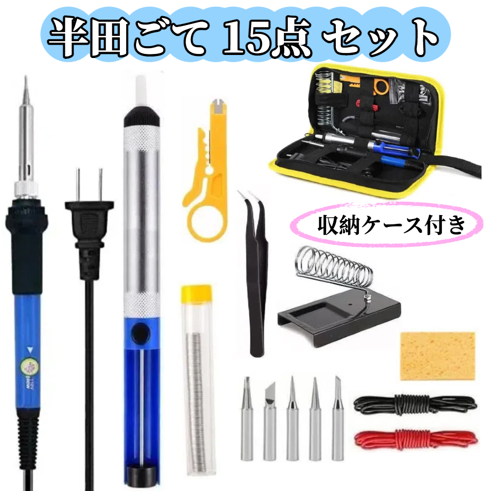 商品内容 | 半田ごて 15点セット ( 半田ごて本体 x1、半田ごてスタンド x1、半田ワイヤー x1、半田すいとり器 x1、電源ケーブル50cm 黒 x1、電源ケーブル50cm 赤 x1、簡易ワイヤーストリッパー x1、ピンセット x1、スポンジ x1、収納ケース x1 、半田ごて替え先 x5 )。 |