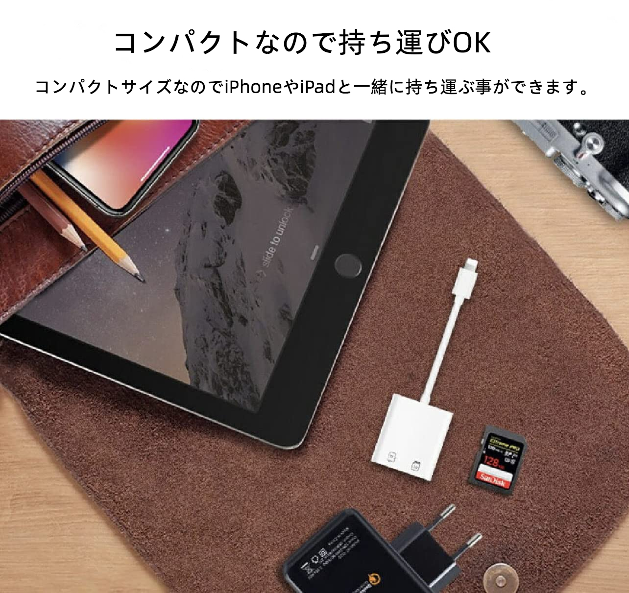 SDカードリーダー 2in1 Phone/Pad対応 カメラアダプタ SD/TFカードリーダー 写真/ビデオ高速転送 メモリカードリーダー 双方向データ転送。