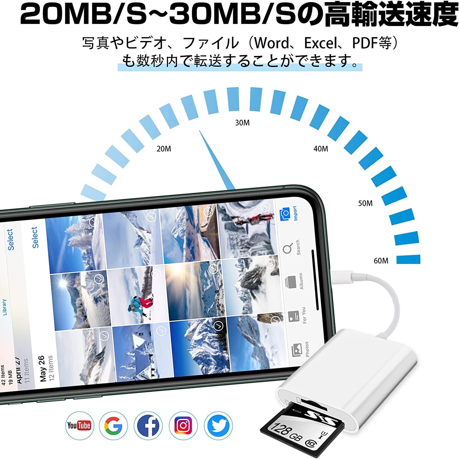 | 商品説明 | 【システム要求】 I0S13以降のデバイスは双方向転送可能。システム9.2〜12.4のデバイスはSD/TFカードからPhone/Padに送信のみ単方向転送可能。phone用システムはI0S 9.2以上が必要です、Pad用システムはI0S 8以上が必要です。※i0S13以降の場合、お客様がファイルアプリを開けることが必要です。本製品を挿し込むあと自動的に画面の変換がしないことをご了承ください。 【高速転送】 最大5Gbpsの高速データ転送ができる、数秒内でスマホの容量を圧迫している写真や動画や各種ファイルをSD/TFカードに移行させて、容量不足が解消できます。 【簡単操作】 プラグアンドプレイ、サードパーティのアプリケーションは不要です。デバイスを接続した後、カメラアプリを自動的に起動し、この携帯電話のSDカードリーダーを介していつでも情報/写真を読み取るために5秒待つ必要があります。 【強力な携帯性】 コンパクトサイズでポケットやバックパックに収納でき、スペースを取りません、保管が簡単です。製品サイズ:13.5*3.7*1.1cm、30g。注意:iOS 13以上または最新のバージョンにアップグレードすることをお勧めします。そうしないと、非互換性が発生する可能性があります。 【幅広い互換性】 iPhone 14/1iPhone4 Pro/iPhone14 Plus/iPhone14 Pro Max/ iPhone 13/1iPhone13 Pro/iPhone13 Plus/iPhone13 Pro Max/iPhone12/iPhone12 Mini/iPhone12 Pro/iPhone12 Pro Max/iPhone11/iPhone11 Pro/iPhone11 Pro Max/iPhoneXs/iPhoneXs Max/iPad Pro/iPad Air/iPad Mini/ iPad mini/mini 2/mini 3/mini 4/Air/Air 2/Pro などに対応。JPEG、RAW等一般的な写真、H.264やMPEG-4形式のSDやHDビデオに対応。(Type-Cをサポートしません)。 |