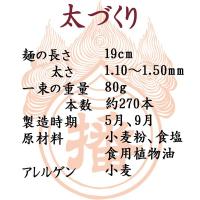 | 麺の長さ/太さ | 19cm/1.10〜1.50mm | | 一束の重量/本数 | 80g/約400本 | | 製造時期 | 5月・9月 | | 原材料 | 小麦粉(小麦(北海道産))、食塩、食用植物油 | | アレルギー情報 | 小麦 |