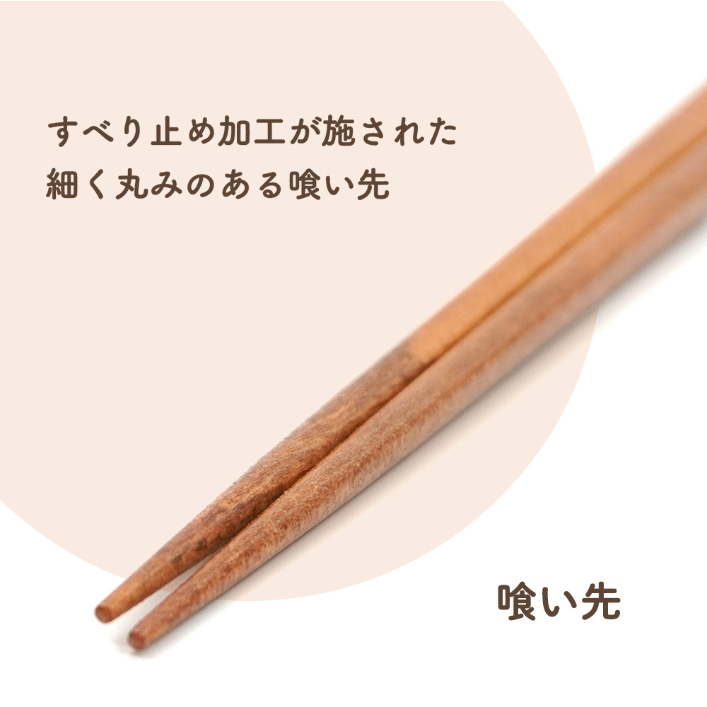 喰い先部分は、細く丸みのある形状で、すべり止め加工が施されているため、食べ物をしっかりとらえます。