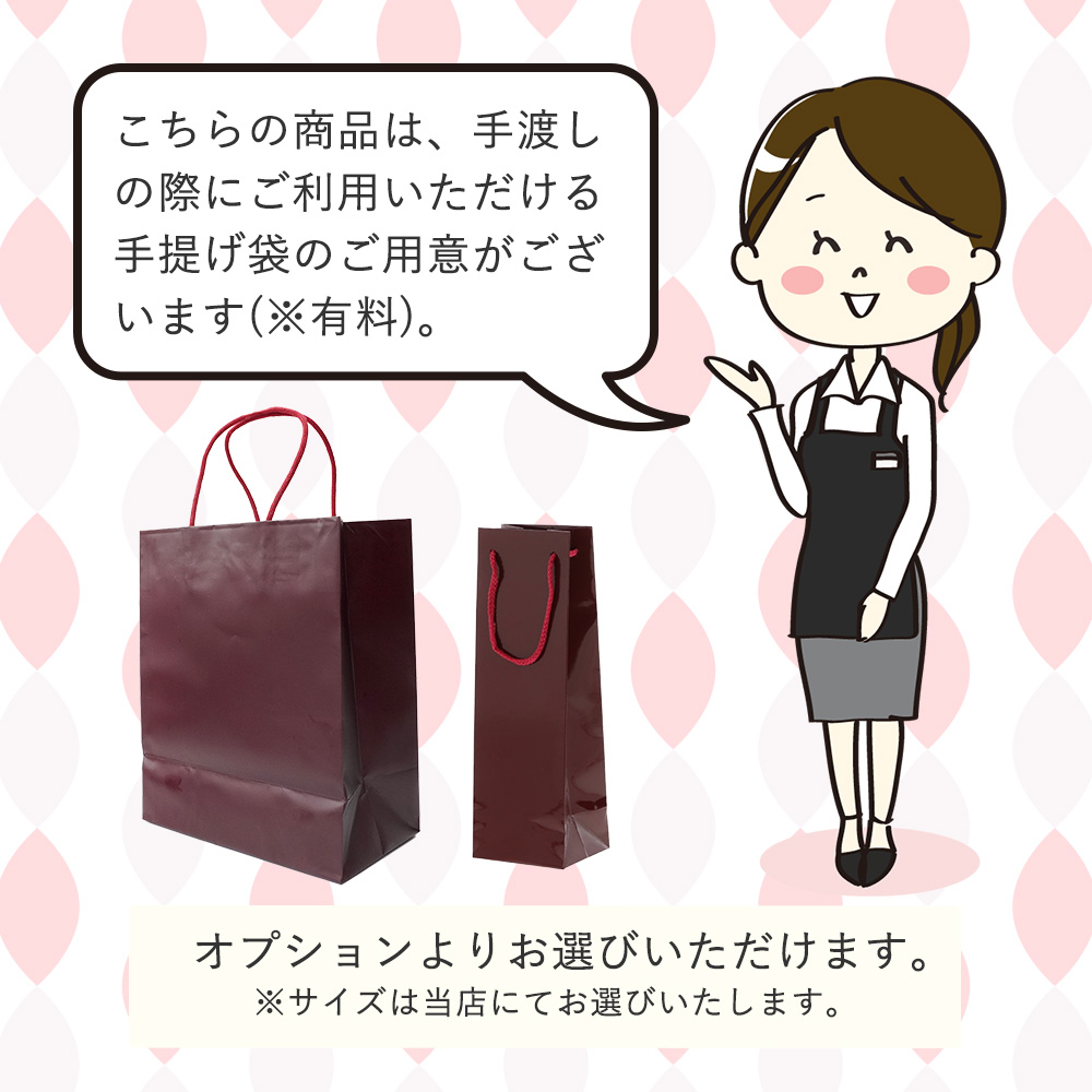 オプションで、包装紙にお花をお付けしたり、持ち運びにちょうどいい手提げ袋やメッセージカードをお付けすることが可能です。