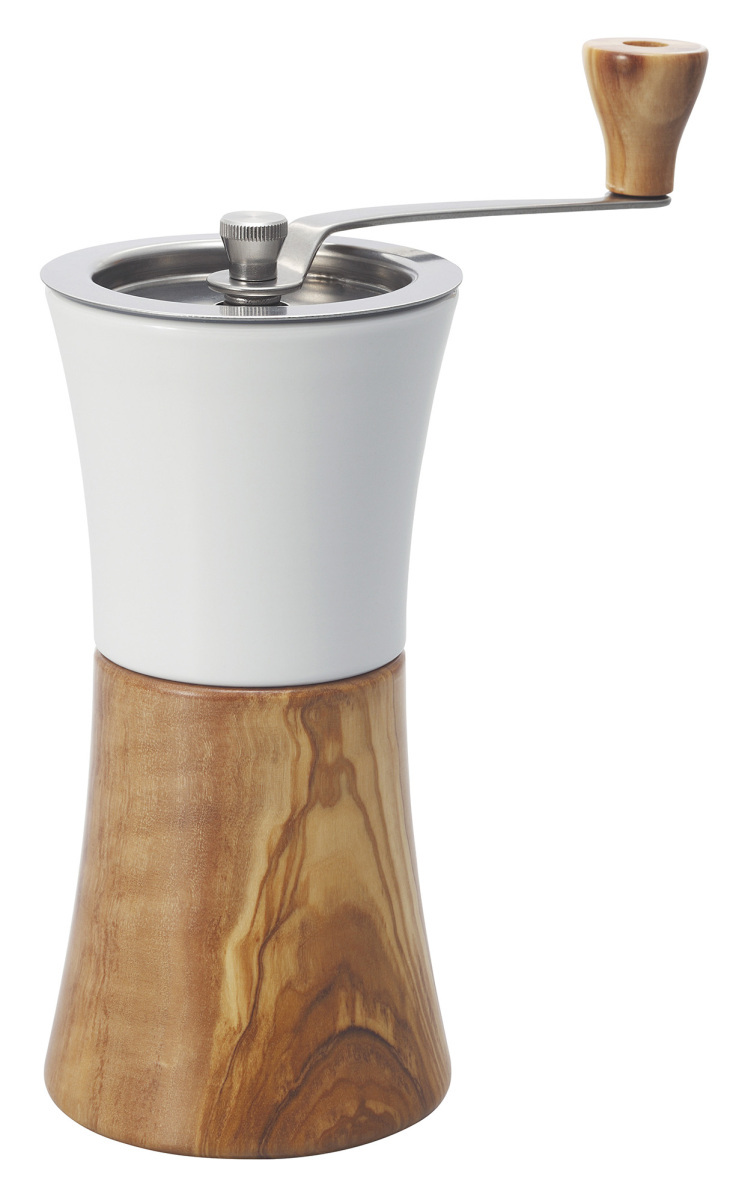 有田焼製ホッパーにオリーブウッドの粉受けを組み合わせたナチュラル感漂うコーヒーミルです。