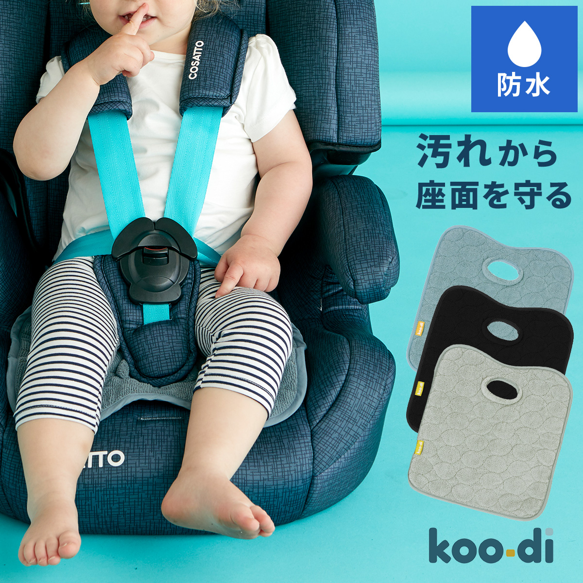 吸水性のある表面のタオル地と防水性のある裏地が、チャイルドシートやベビーカーなどを汚れから守ってくれます!