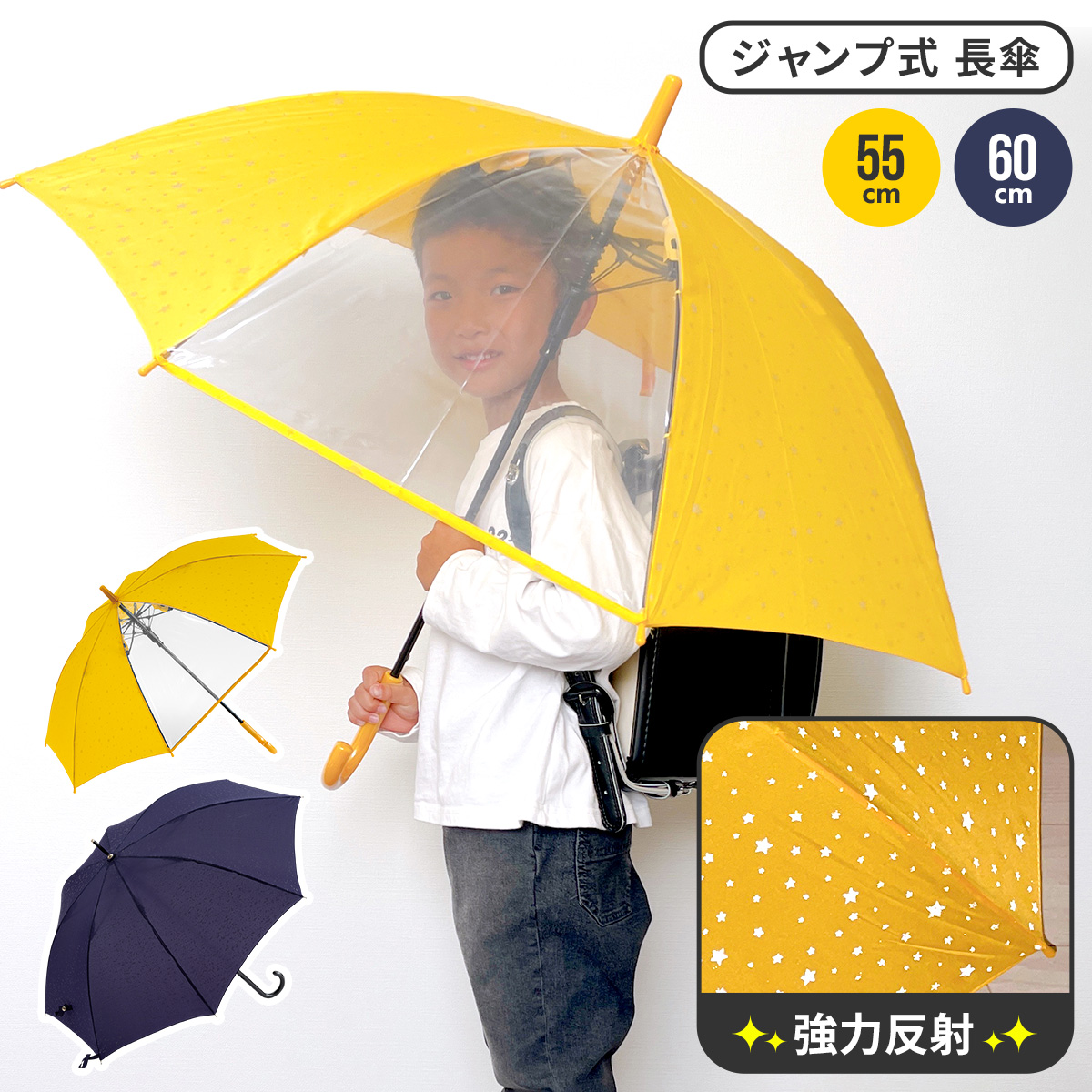 傘 長傘 雨傘 ジャンプ傘 子供用 レディース 子ども 子供 こども 55cm 60cm 強力反射プリント 耐風仕様 小学校高学年 黄色 紺色 窓付き