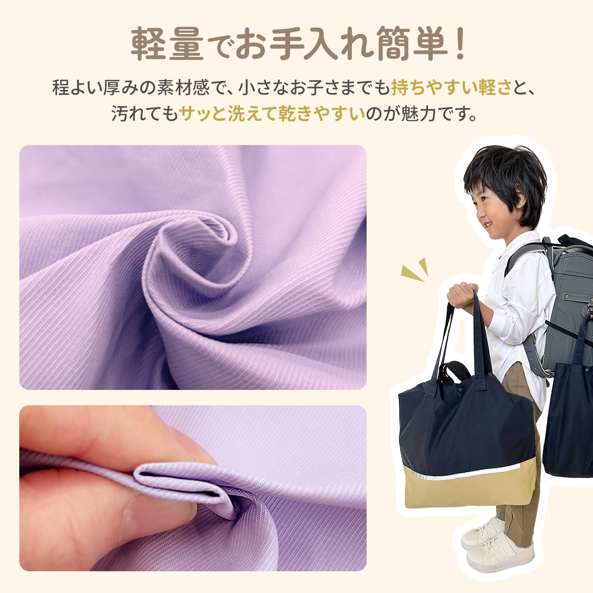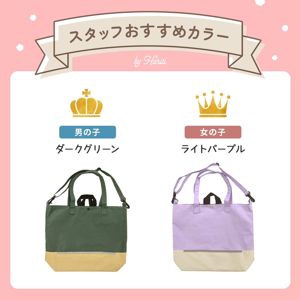 入学準備に!Haritiオリジナル レッスンバッグ☆Haritiオリジナルのレッスンバッグは、入学を迎えるお子さまにぴったりのアイテムです。シンプルでおしゃれなデザインが魅力で、男の子も女の子も使いやすいです。ショルダー部分は取り外し可能で、リフレクター付きなので夜道も安心。学校の机に引っ掛けられるループや便利な内ポケット、底マチも備えています。持ち手は肩にかけやすい長さで使い勝手抜群です!
