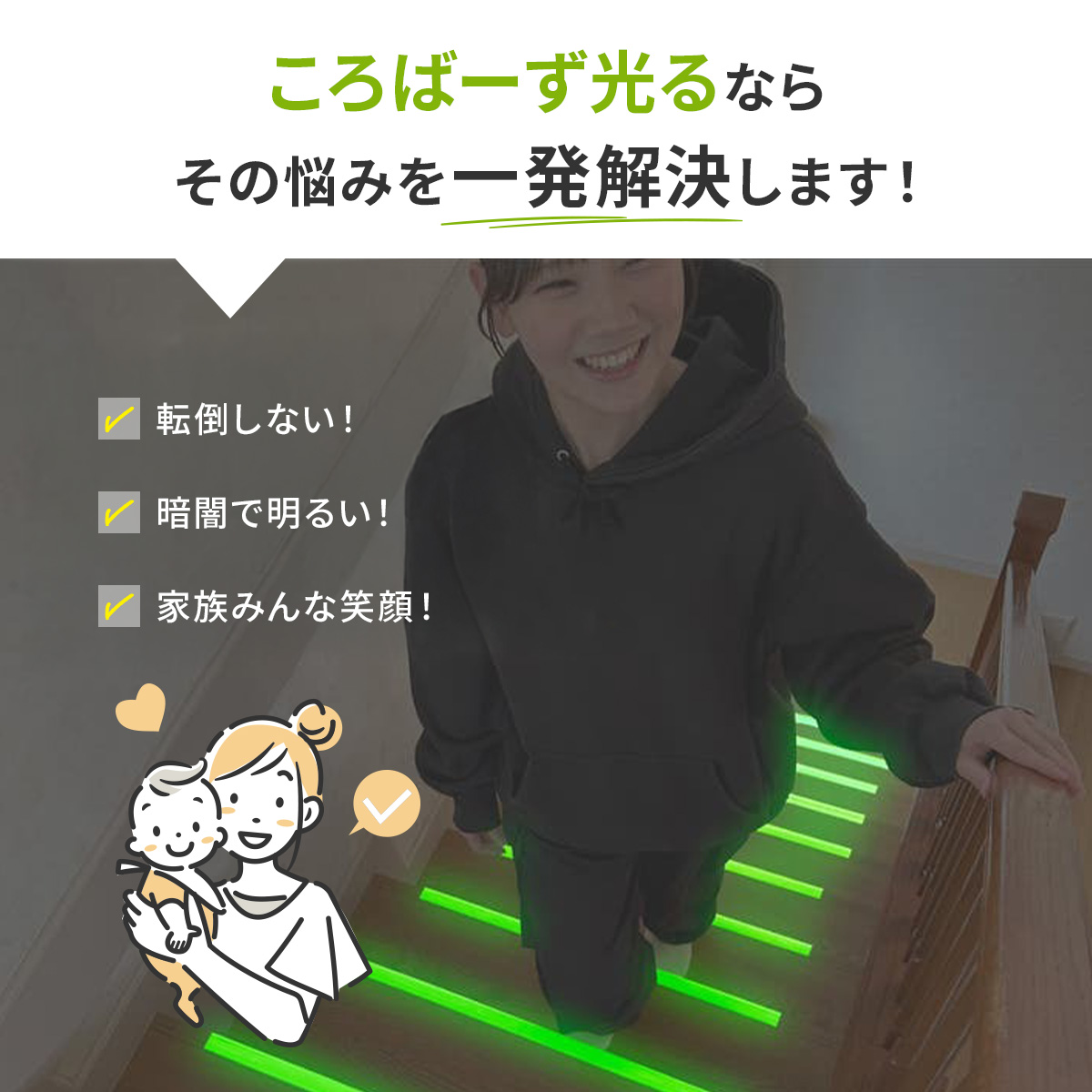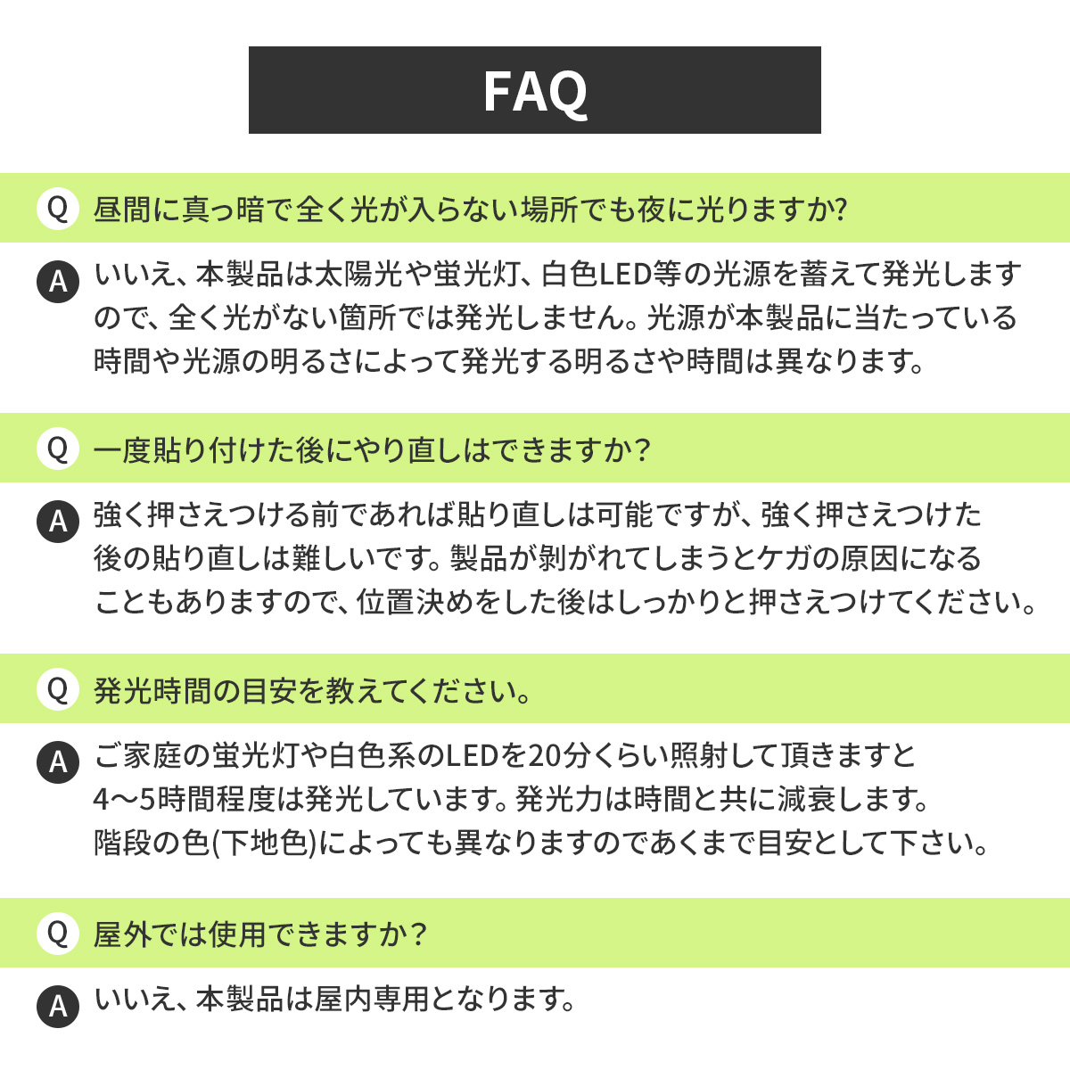 ※本製品は光を蓄えて発光します。全く光がない場所では発光しませんので、昼間日光が当たる階段や少し電気を当ててからご使用ください。