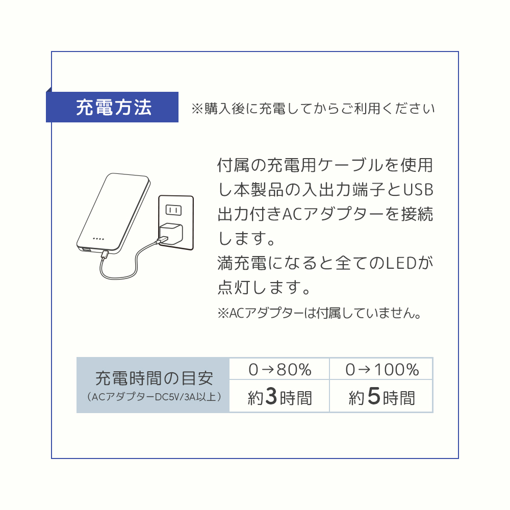 ・本製品は、DC5V3Aでの充電に対応しますが、電池残量やお使いのACアダプター、環境温度により充電時間は異なります。