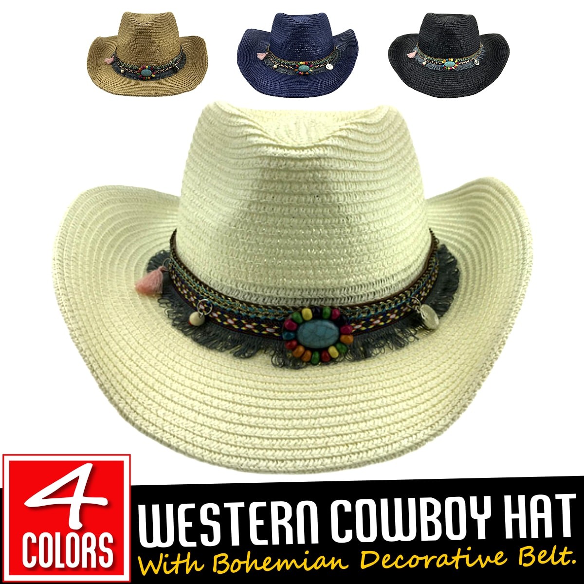 【送料無料!】全4色! ボヘミアンデコラティブベルトウェスタンカウボーイハット! 帽子 テンガロン ストローハット 麦わら 男女兼用 バイクに