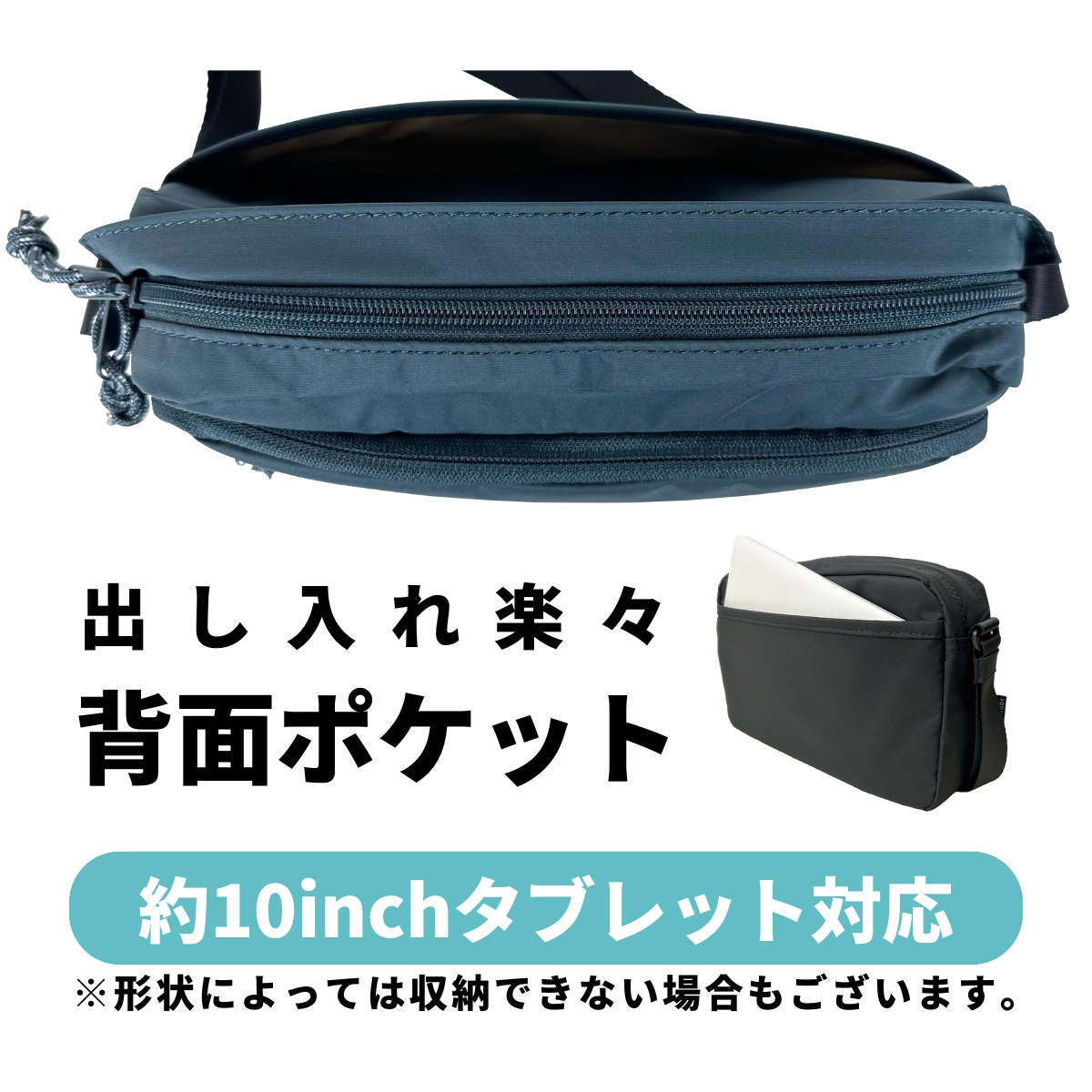 背面 約10インチタブレット対応 ※形状によっては収納できない場合もございます。