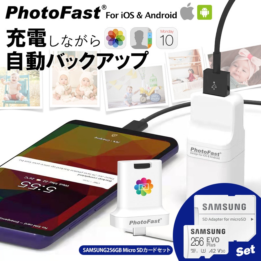 【PhotoCubePro/C+ for iOS & Android SAMUSUNG 256GB SDカードset】充電しながらデータ自動バックアップ microSDカード付属