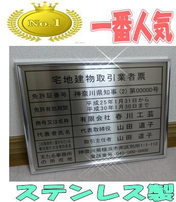 【人気No.1】宅地建物取引業者票【本物の金属ステンレス製】シルバー額入り・板面は高級ステンレス 宅地建物取引業者票