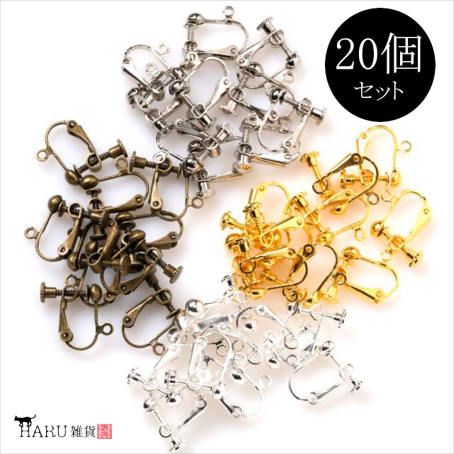 イヤリングパーツ 20個セット ネジバネ式 丸皿 カン付き ハンドメイド 金具 ピアス パーツ アンティーク ゴールド シルバー ホワイトシルバー 金 銀 金古美
