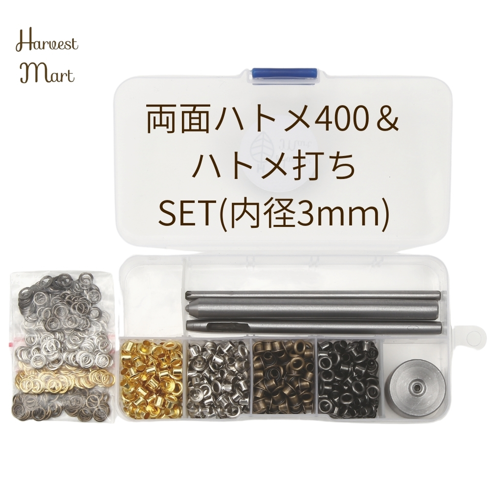 両面ハトメ 3mm はとめ ハトメ工具 菊割棒 穴あけ工具 ハトメ割り うち台 鳩目セット 保証書付 (両面ハトメ400set+はと目工具4set)