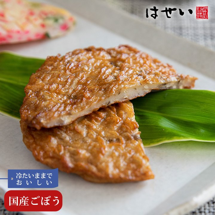 岡山の老舗、昭和4年創業のかまぼこ・さつま揚げ店「長谷井商店」が職人の手作りで製造。ごぼう天専用のすり身で国産ごぼうの風味と自然な甘みを引き出した、はせいの中でも定番のさつま揚げ(天ぷら)です。ごぼうの香りとシャキッとした食感が魚の旨みと調和し、噛むほどにコクが広がります。