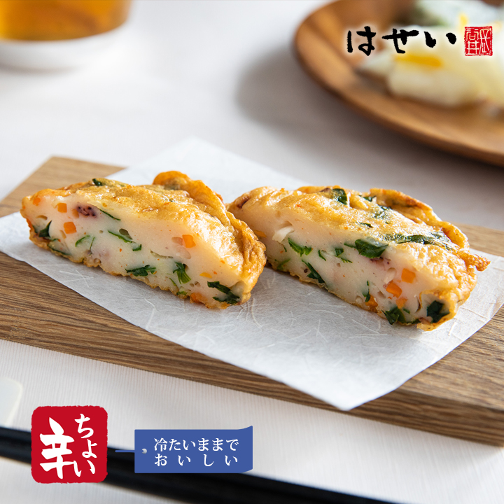 岡山の老舗、昭和4年創業のかまぼこ・さつま揚げ店「長谷井商店」が職人の手作りで製造。ニラをたっぷり使用し、イカともやしを合わせた、チヂミ風のさつま揚げ(天ぷら)です。香ばしい風味とやさしい口当たりが特長で、野菜の食感とイカの旨みが広がる満足感のある一枚に仕上げました。