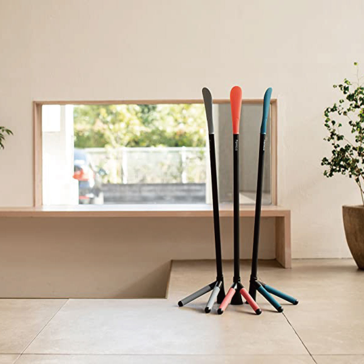 玄関で靴の脱ぎ履きを助けるシューホーンは、立ったまま使えるデザイン。壁もフックもいらない「自立デザイン」でどこにでも置いておけます。
