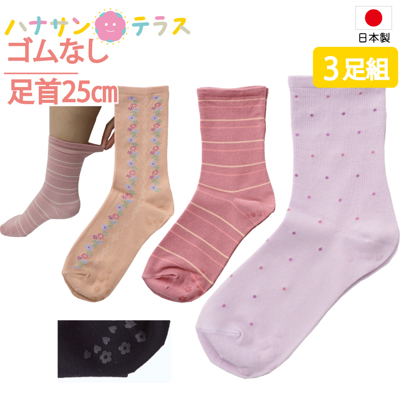 介護 靴下 3足セット 日本製 足首ゆったり ソックス レディース 婦人 用 春夏秋冬 シルク混 滑り止め付き 介護用靴下 履き口広い ゆるい のびる 締め付けない むくみ リハビリ 介護用衣料 高齢者 女性 シニア 柄お任せ