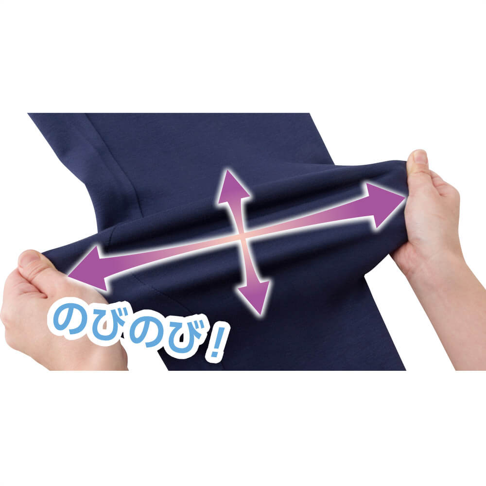 のびのび…ご自身で着るときも介助してもらう時でも生地が伸びるので、関節が硬くなりがちなかたでも脱ぎ着がスムーズ。ほどよいストレッチ性で体にやさしくフィット。(縦横)