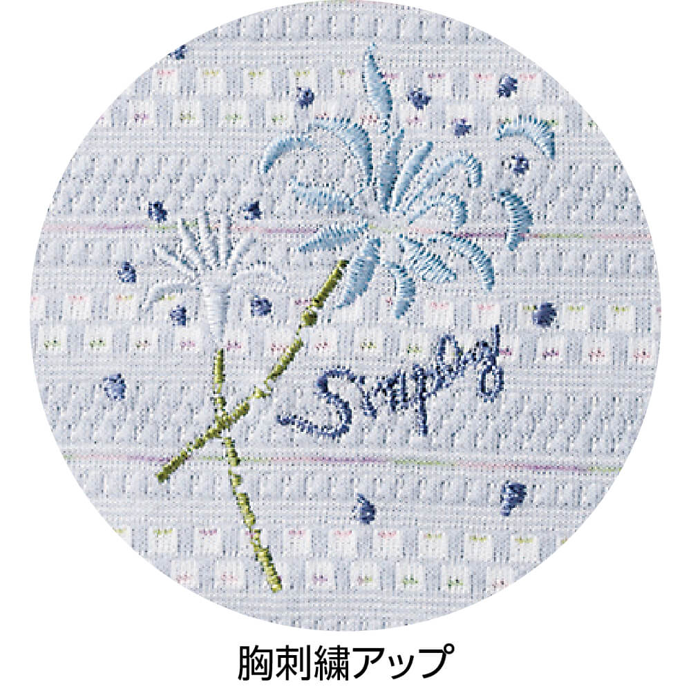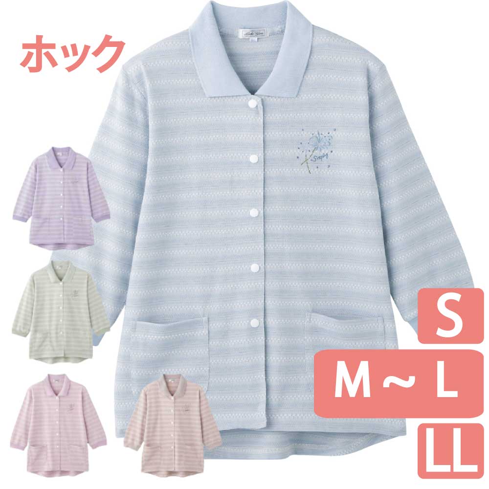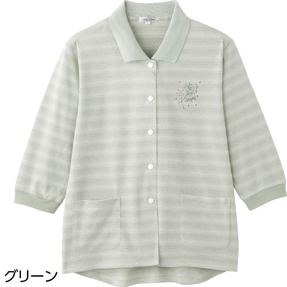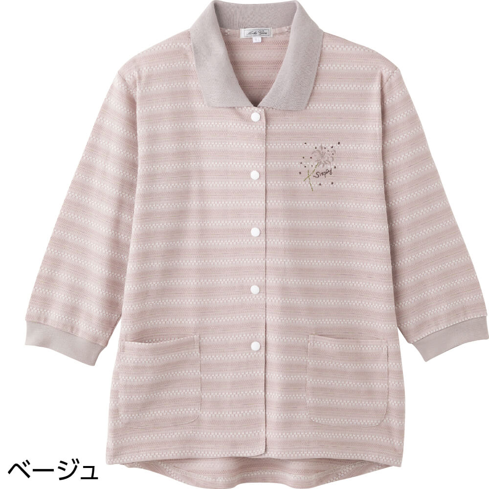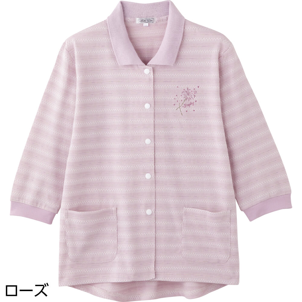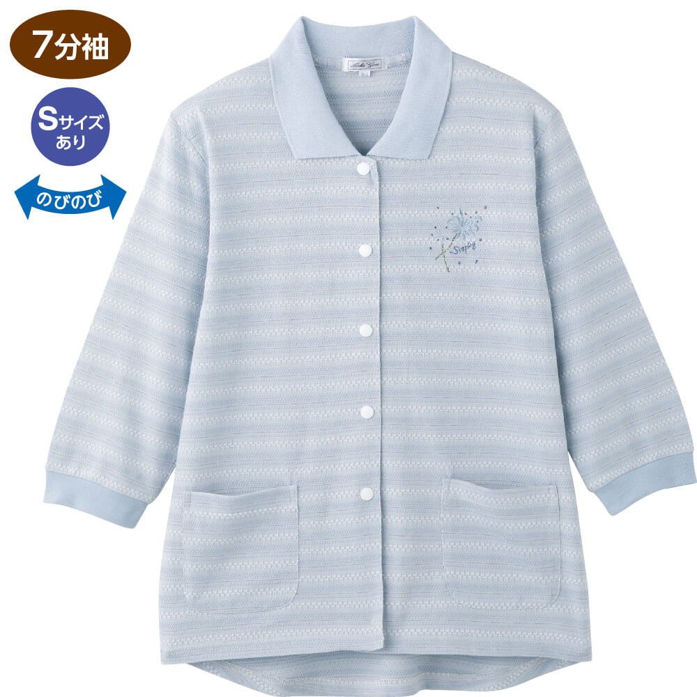 その他…胸刺繍。スナップボタン。前ポケット付。後ろ身頃長め(腰曲がり体型/腰の曲がった人/背中をカバー/背中が出にくい/背中が出ない/前かがみ/猫背/車椅子)。身幅ゆったり。のびのび(伸びる/伸びやすい/着やすい)。7分袖。Sサイズあり。