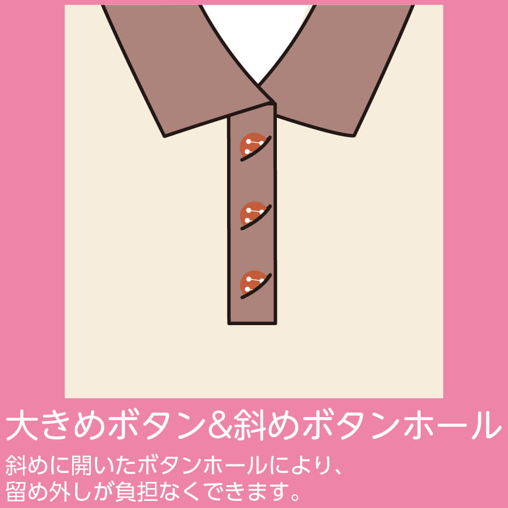 その他…大きめボタン&斜めボタンホール。前ポケット付。後ろ身頃長め(腰曲がり体型/腰の曲がった人/背中をカバー/背中が出にくい/背中が出ない/前かがみ/猫背/車椅子)。身幅ゆったり。のびのび(伸びる/伸びやすい/着やすい)。