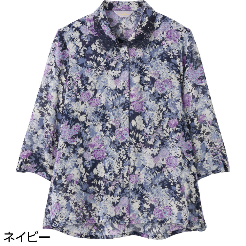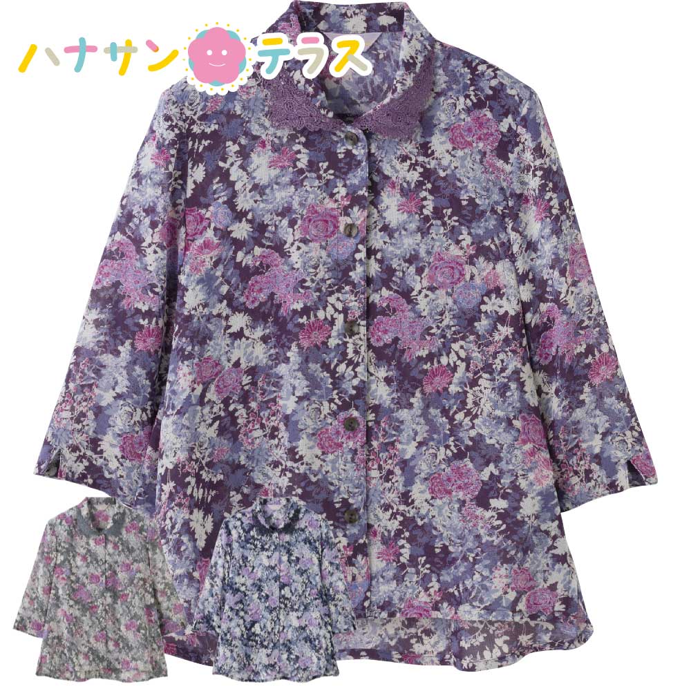 7分袖ワンタッチテープブラウス M L 後ろ身頃長め 腰曲がり体型 腰の曲がった人 背中をカバー 背中が出にくい 前かがみ 猫背 車椅子 シニアファッション 70代 80代 90代 100歳 レディース 婦人 用 マジックテープ 身幅ゆったり