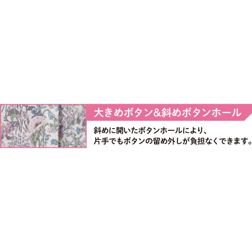 ボタン仕様…大きめボタン&斜めボタンホール(ボタン留めはできるけれど、最近つかみにくくなったと感じている方には、大きくてつかみやすいボタンがおすすめです。斜めに開いたボタンホールは、片手でも留め外しがしやすく、大きめボタンとの組み合わせでさらに留め外しがスムーズに)