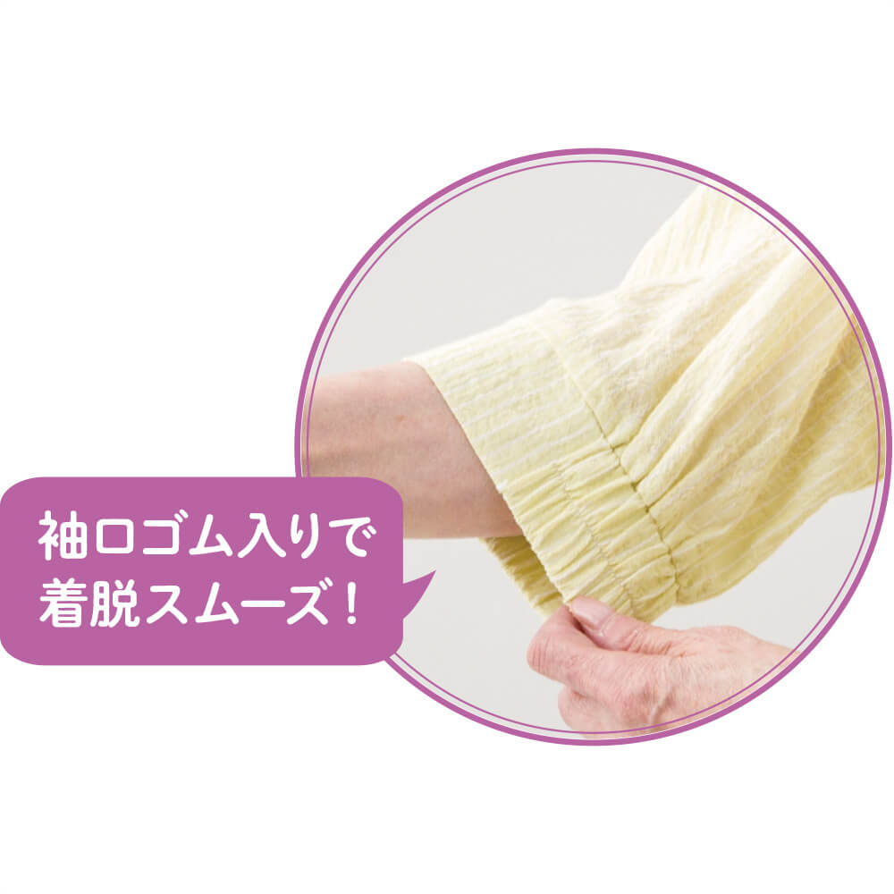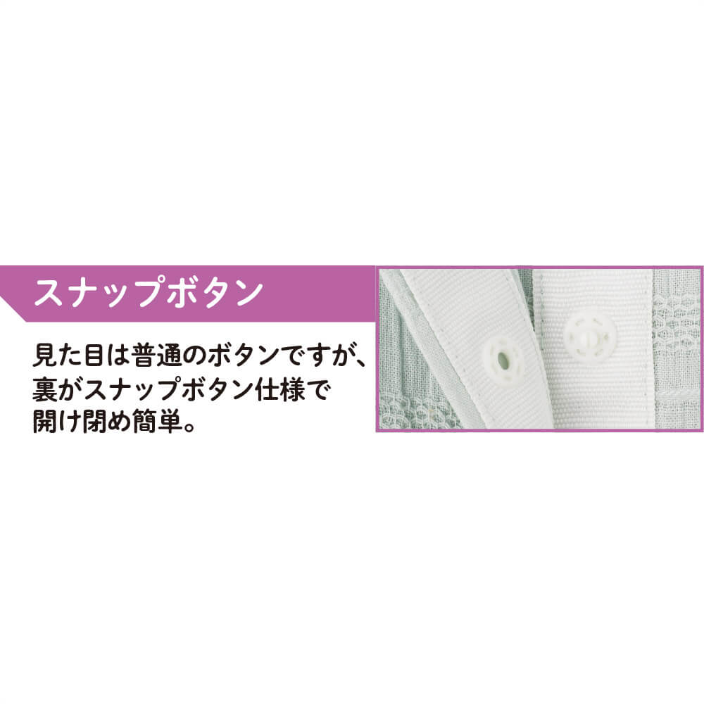 ボタン仕様…スナップボタン(ボタンを留めるときはパチンと合わせるだけ、外すときは引っ張るだけ。着替え時間も短くて済み、介助する方もされる方も負担を軽減できます。)
