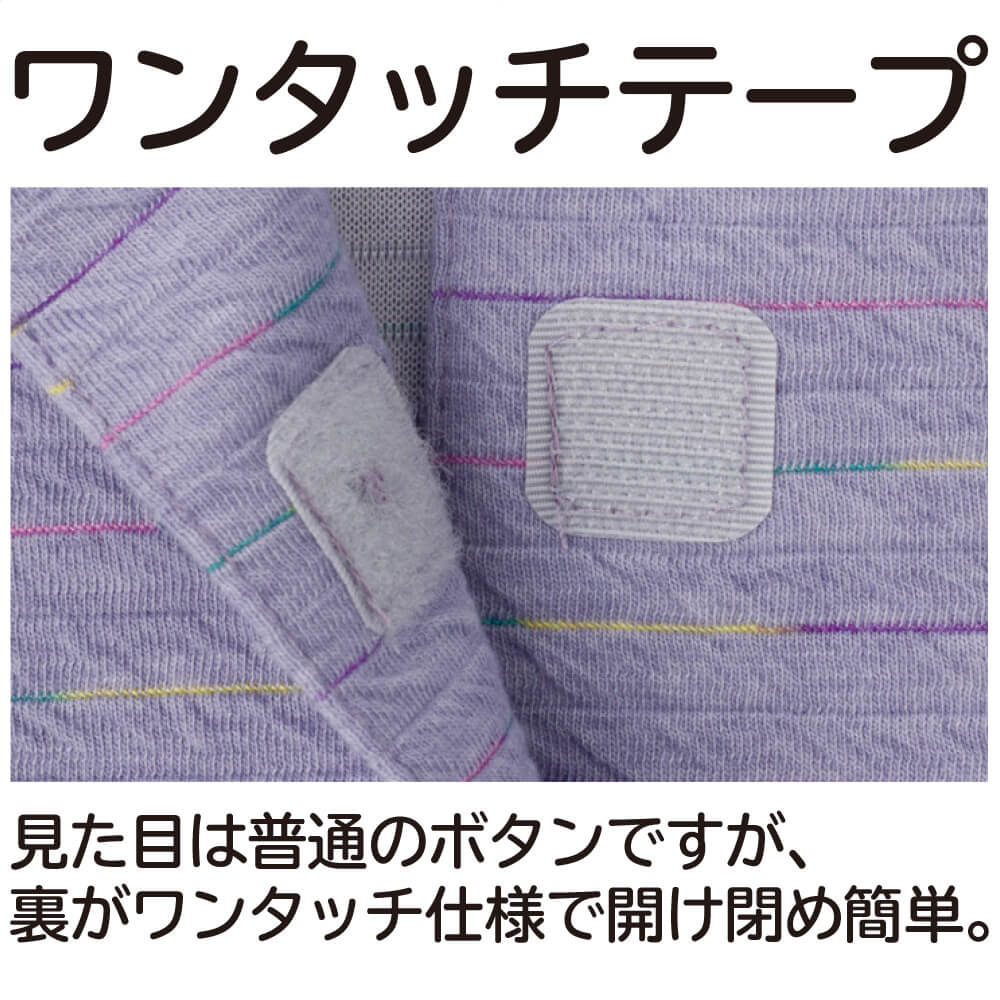 ボタン仕様…ワンタッチテープ(自分で服の脱ぎ着をしたい方におすすめ。面ファスナーを合わせるだけだから、留めるのも簡単。飾りボタンがついているので見た目は普通の服と変わりません。)