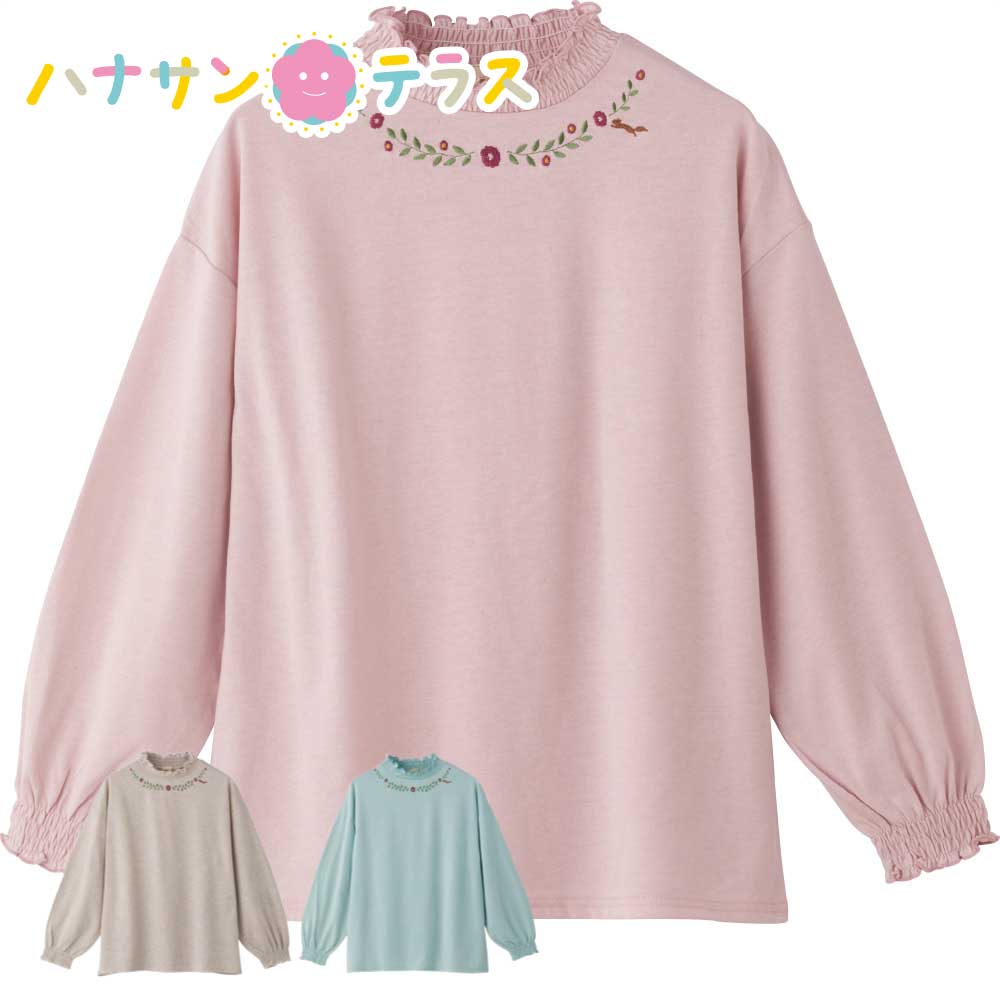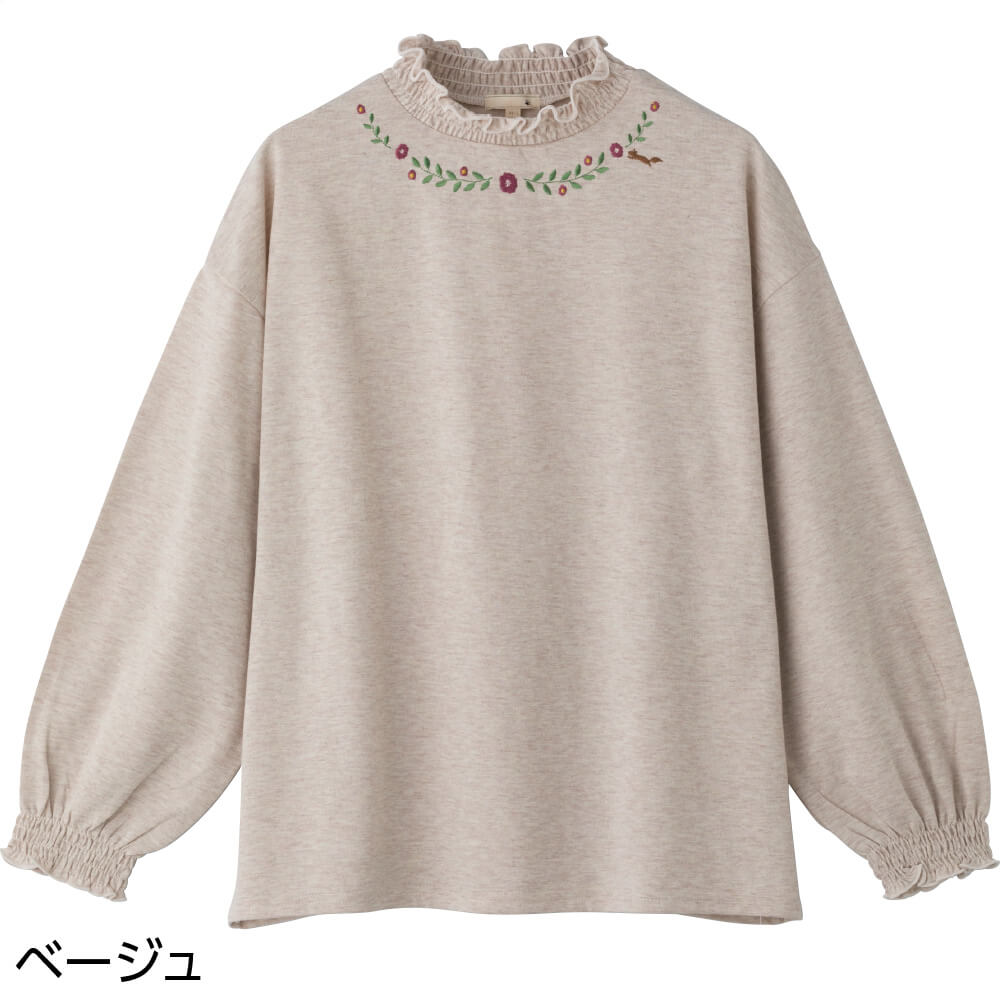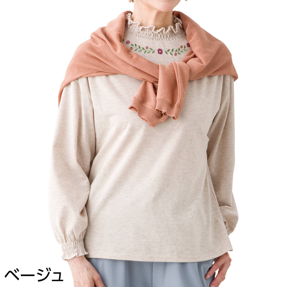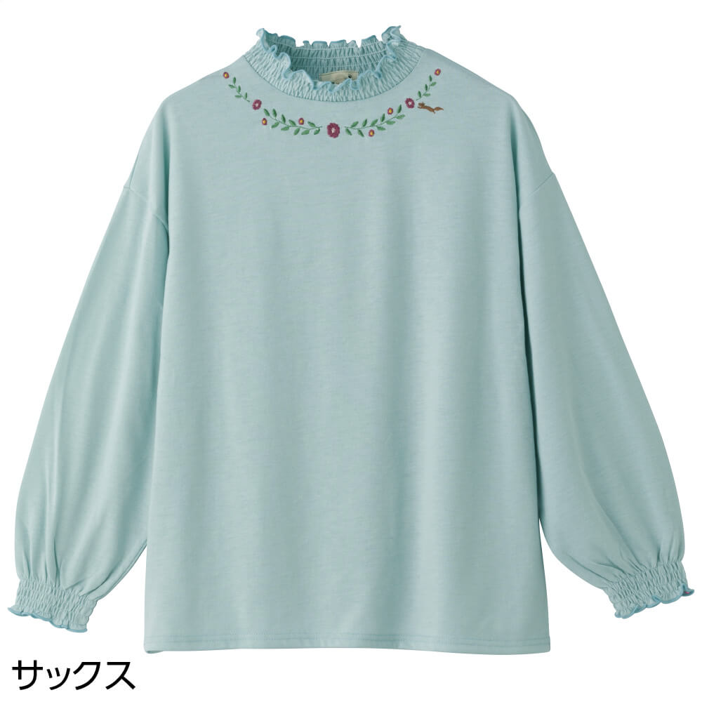 衿元と袖がシャーリングで伸びるので着脱スムーズ。花柄刺しゅうがアクセント。