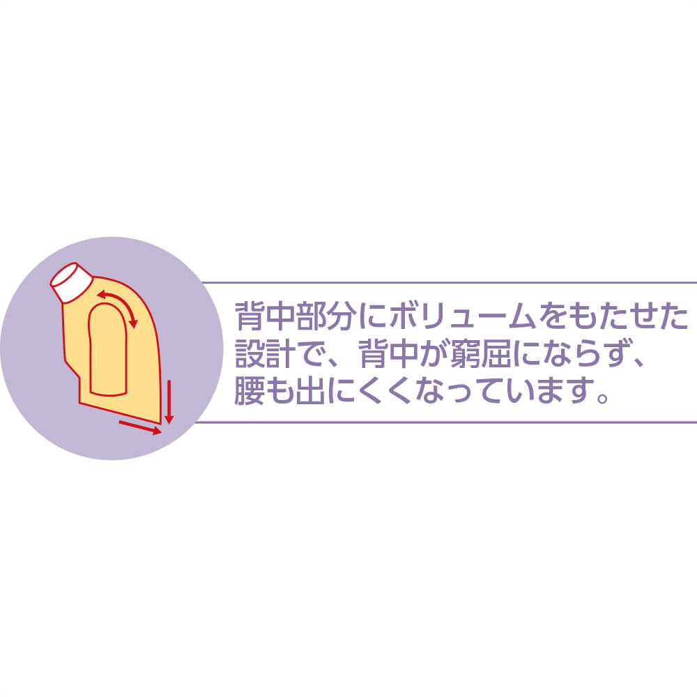 後ろ身頃長め…後ろ身頃長めだから腰や背中が曲がってきた方でも背中が見えにくいのでキレイなシルエットに。(腰曲がり体型/腰の曲がった人/背中をカバー/背中が出にくい/背中が出ない/前かがみ/猫背/車椅子)