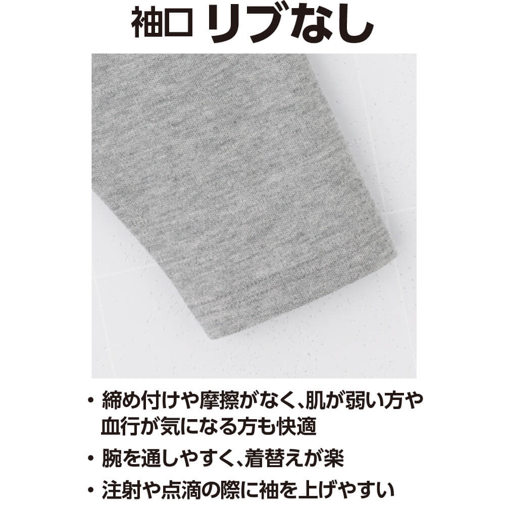 袖口がリブなしの為、締め付けや摩擦がなく、肌が弱い方や血行が気になる方も快適。注射や点滴の際に袖を上げやすく便利。