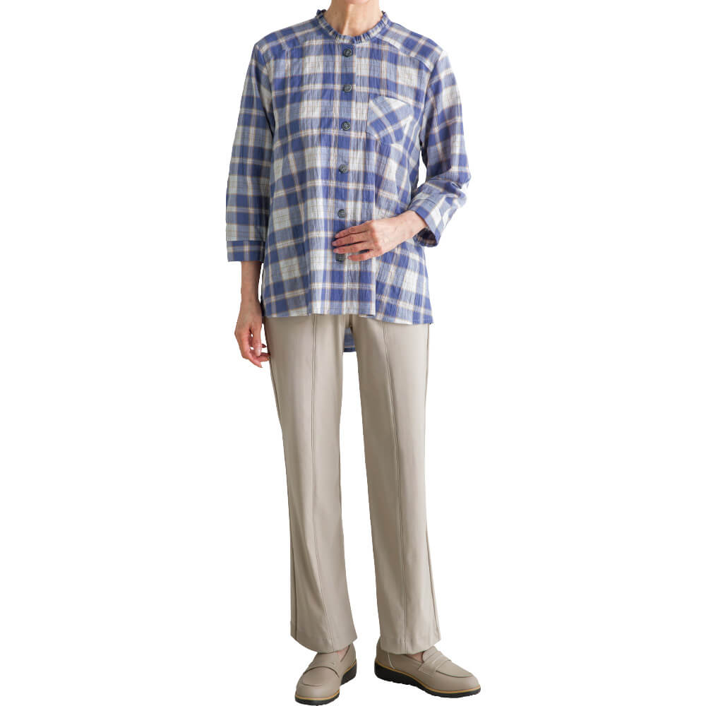 のびのび…ご自身で着るときも介助してもらう時でも生地が伸びるので、関節が硬くなりがちなかたでも脱ぎ着がスムーズ。ほどよいストレッチ性で体にやさしくフィット。(縦・横)
