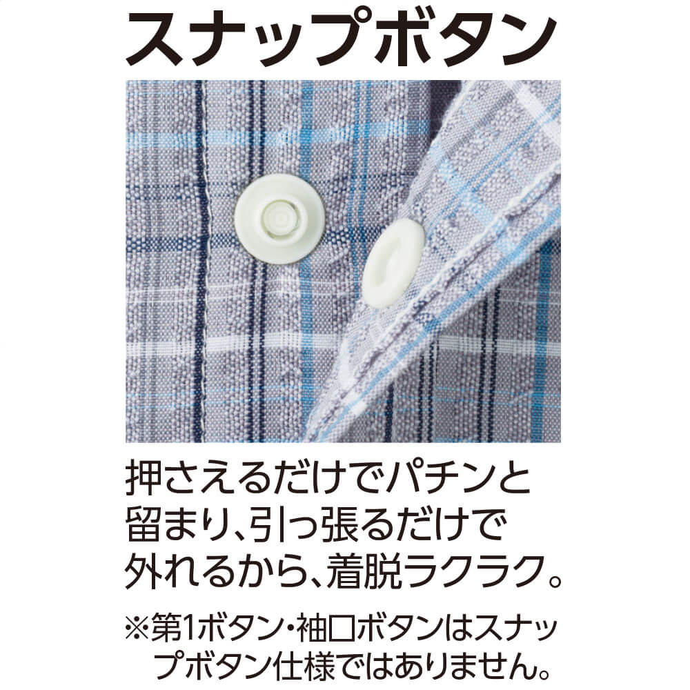 ボタン仕様…スナップボタン(ボタンを留めるときはパチンと合わせるだけ、外すときは引っ張るだけ。着替え時間も短くて済み、介助する方もされる方も負担を軽減できます。)