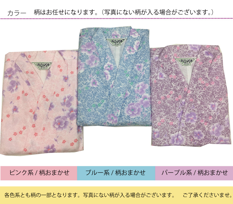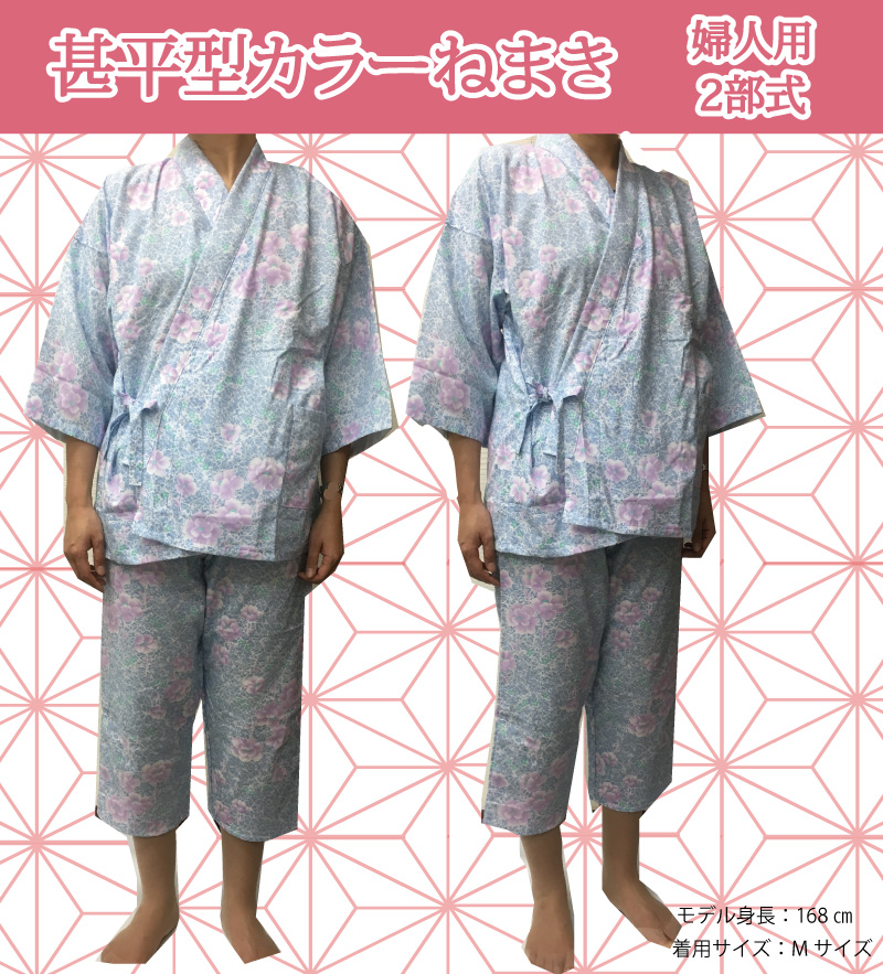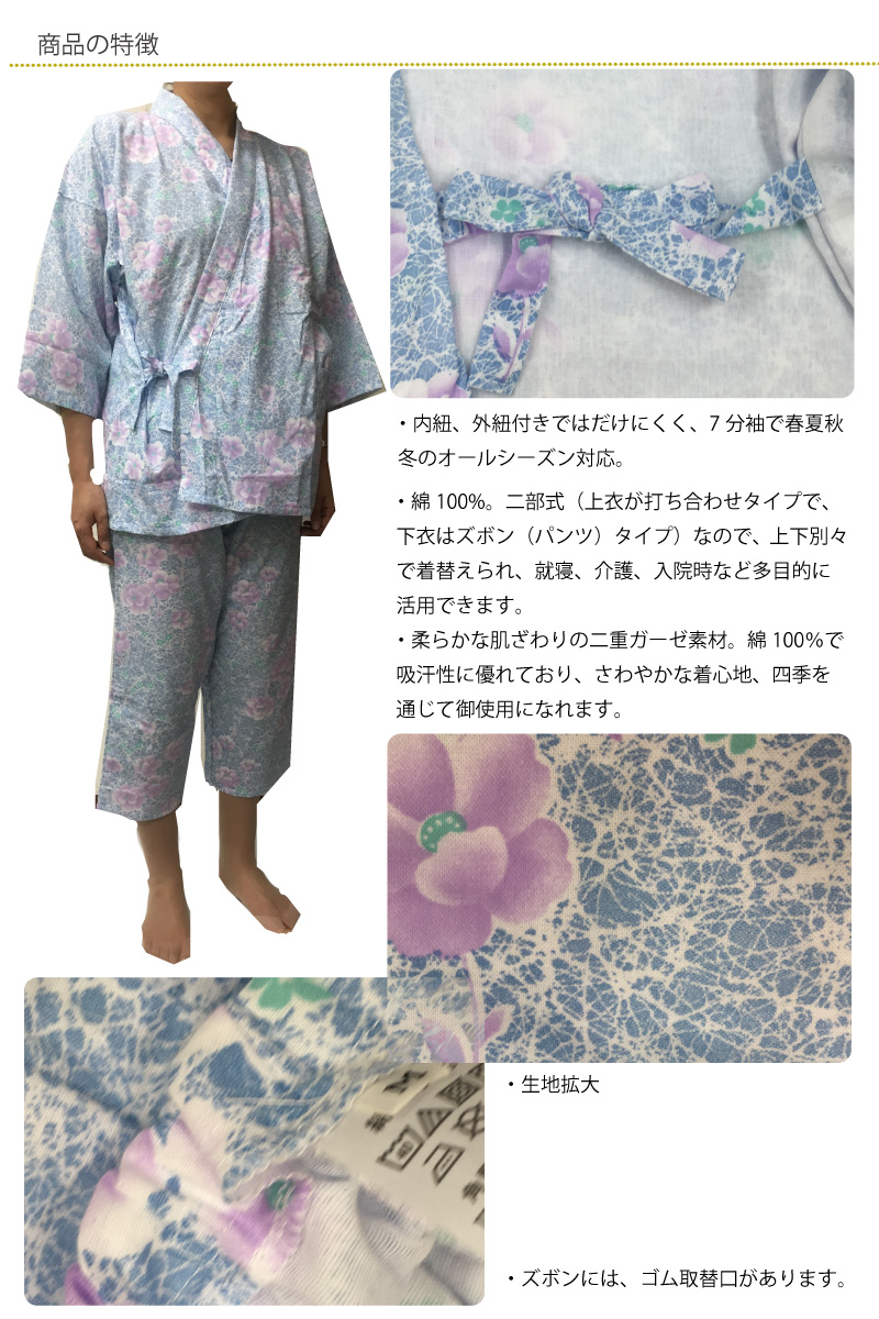 ・二部式(上衣が打ち合わせタイプで、下衣はズボン(パンツ)タイプ)なので上下別々で着替えられ大変便利な寝巻きです。