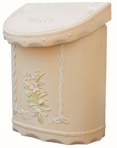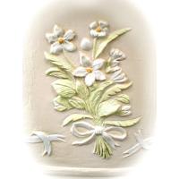 本体は素焼き調で、花とリボンの部分は釉薬(うわぐすり)を塗ったイメージです。