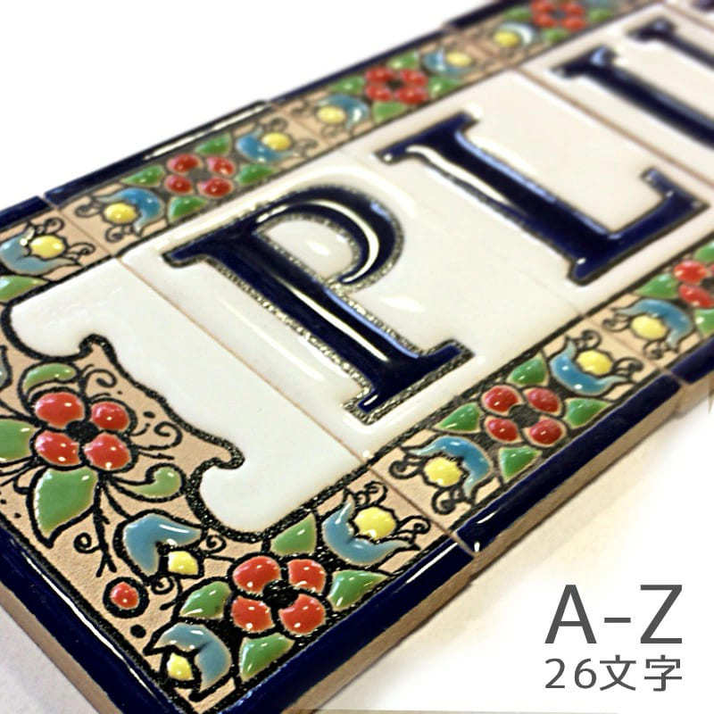 スペイン製のタイルは、モザイクのデザインと色合いが鮮やかなな表札に仕上がります。ルームプレートやわんちゃんのお部屋など、ファサードに限らずお使いいただけます!