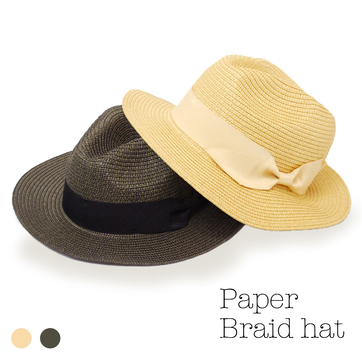 杢調のミックスカラーのブレードハット!ペーパー素材ですが、麦わら帽子やストローハットとして扱われている事が多い素材です。つばは大きすぎず、日差しはしっかり防げる!上品な少し光沢のあるグログランリボンは本体同系色でシンプルに仕上がっています。カジュアルな中にもちょっとエレガントさを兼ね備えたデザイン。男女関係なく暑い季節には持っておきたいアイテム!サイズ調節も可能なため、ご自身の頭まわりのサイズに合わせて被ることもできます。同じデザインで、キッズサイズもあるので親子でお揃いコーデもできますよ♪ハットですが柔らかい素材で出来ているため、折りたたむことができ、くるくるっと小さく折りたたんでも元の形に戻ります。