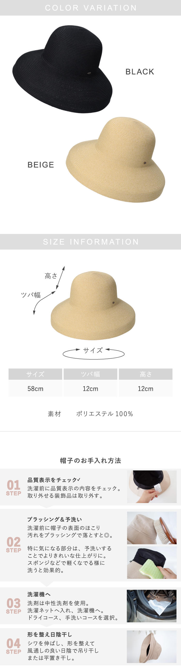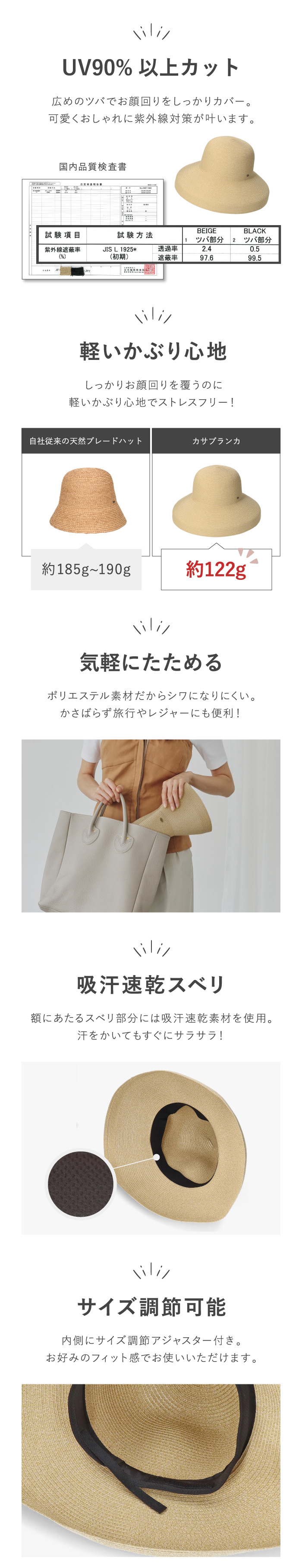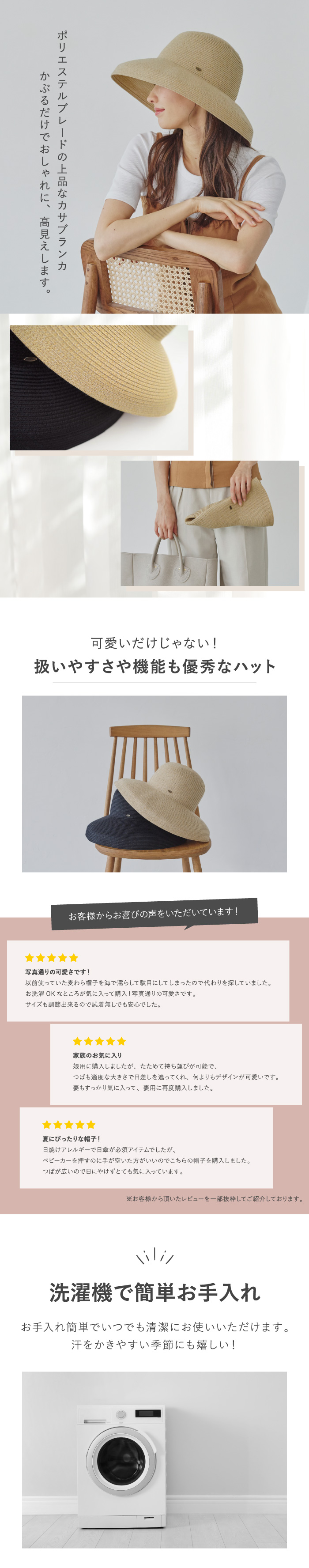 | 商品説明 | ペーパー風のブレードを使用したカサブランカハット。ポリステル素材なので洗うことができ、なんと洗濯機洗いにも対応しています!エレガントに見えるカサブランカ型で、日常のUV対策にはもちろんリゾート等でも映えるシルエット。左サイトに小さなアンティークゴールドのプレートがついたシンプルなデザインです。サイズ調整が可能なのでお好みの被り心地に調整できます。 ※掲載画像は室内外での撮影による明度の違いや、閲覧いただいているディスプレイの明暗等により、色味が実物と異なって見える場合がございます。 ※生産過程においてサイズ感や形に個体差が生じる場合がございますので表記サイズは目安としてお考えください。 |