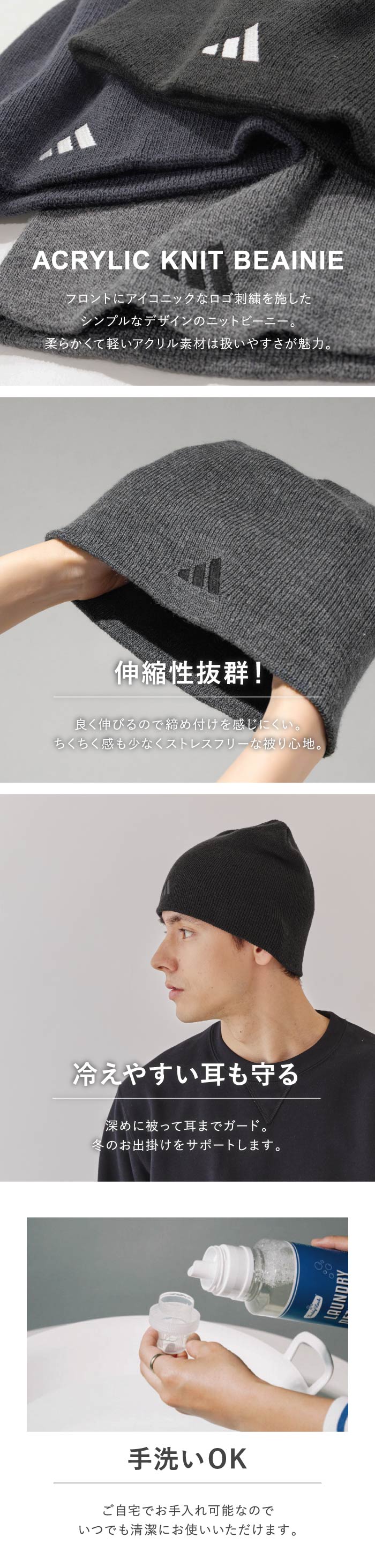 | 商品説明 | アクリル糸を使用したニットビーニー(裾の折り返しのないニット帽)。 程よいボリューム感と肌触りの良い冬の必須アイテム。シンプルなロゴ刺繍でアディダスらしいカラー展開です。 手洗いが可能なので、ご自宅で手軽にお手入れ可能です。 ※掲載画像は室内外での撮影による明度の違いや、閲覧いただいているディスプレイの明暗等により、色味が実物と異なって見える場合がございます。 ※生産過程においてサイズ感や形に個体差が生じる場合がございますので表記サイズは目安としてお考えください。 |