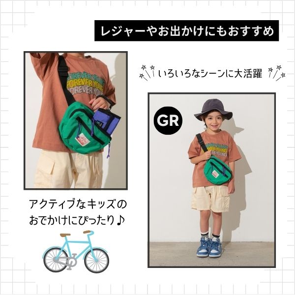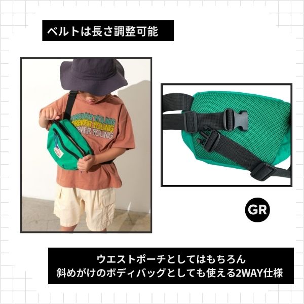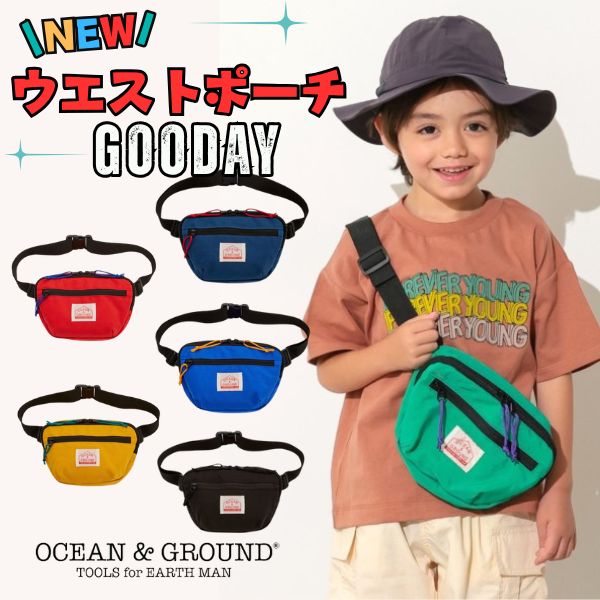 大人気!!GOODAYシリーズのウエストポーチが使いやすさをアップしてリニューアル♪ ウエストポーチとしてはもちろん、斜めがけのボディバッグとしても使える2WAY仕様。使いやすい2ZIPポケット。背面には蒸れにくいWラッセルメッシュを使用し快適な着用感。両手が空くからアクティブなキッズのおでかけにおすすめです。