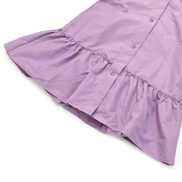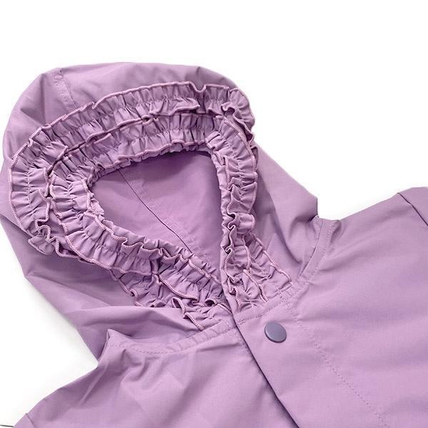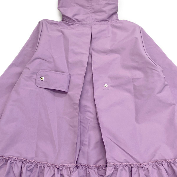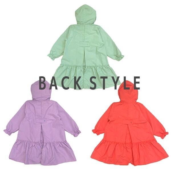裾にギャザーを入れた、ワンピースみたいなデザインの大人気レインコート。マチ巾をより広くとりリニューアル☆フードにはフリルがついてさらにかわいさUP!背中部分のスナップボタンを外せば、リュックを背負ったままでも羽織れます。(LサイズはランドセルもOK!)収納袋もついていて機能性もファッション性も◎です。