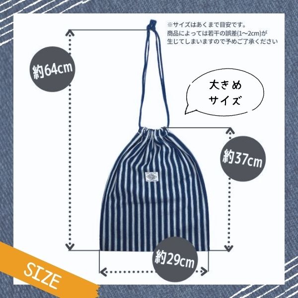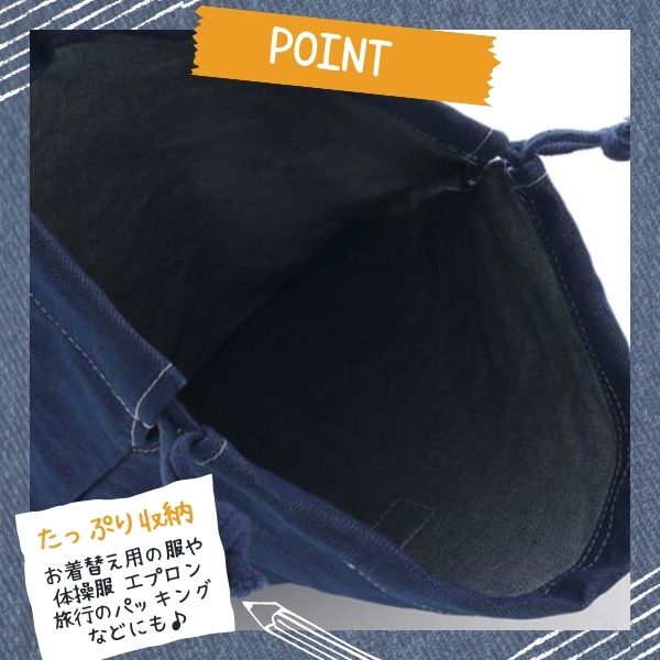 シンプル、かつオシャレなデニム&ヒッコリーの巾着が素材を変えてリニューアル。表は小さいブランドタグ、裏はお名前を書けるタグになっているところも◎お着替え用の服や体操服などを入れるのにピッタリのサイズ感。旅行時のパッキングにも便利です!
